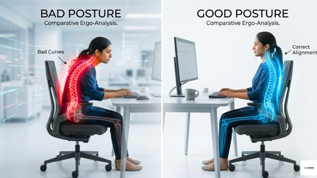 हमारी रीढ़ की हड्डी (Spine) पूरी तरह सीधी नहीं होती, इसमें प्राकृतिक रूप से ‘S’ आकार के तीन कर्व होते हैं। सही तरीके से बैठने का मतलब है इन कर्व्स को बनाए रखना। जब हम गलत बैठते हैं, तो मांसपेशियों को शरीर को संभालने के लिए अतिरिक्त मेहनत करनी पड़ती है, जिससे थकान और दर्द शुरू हो जाता है।